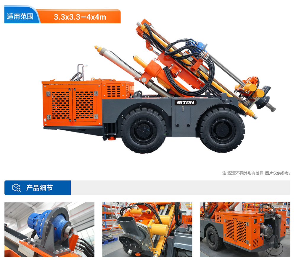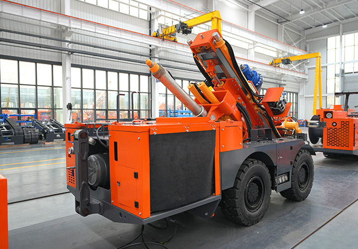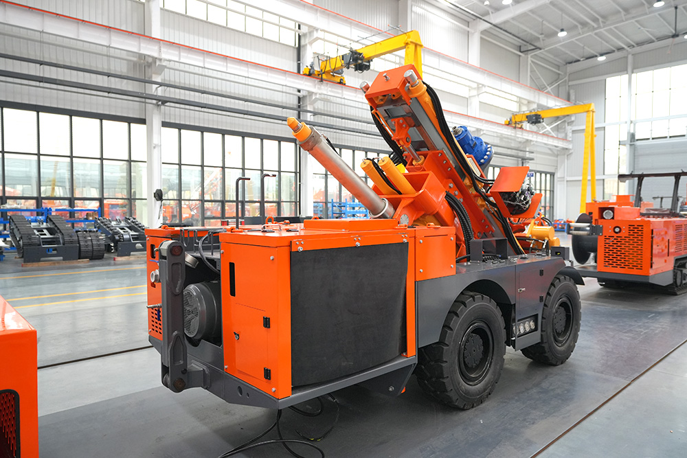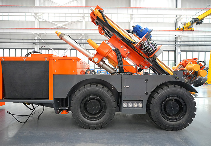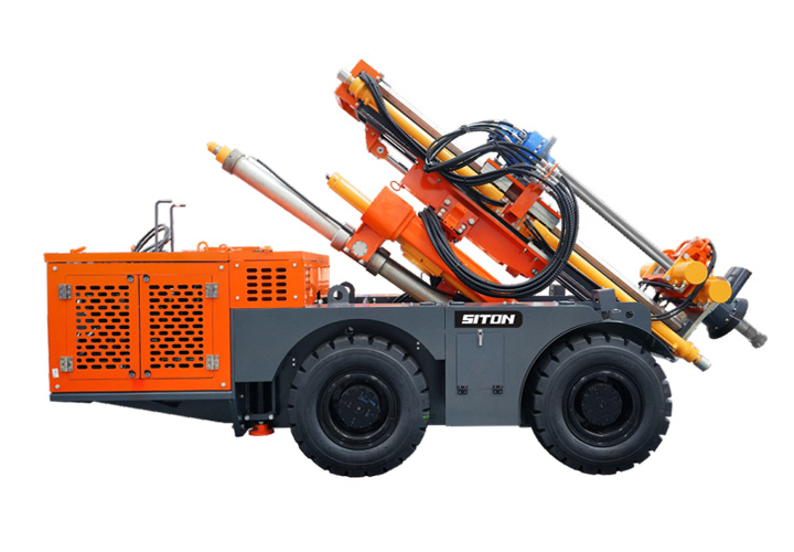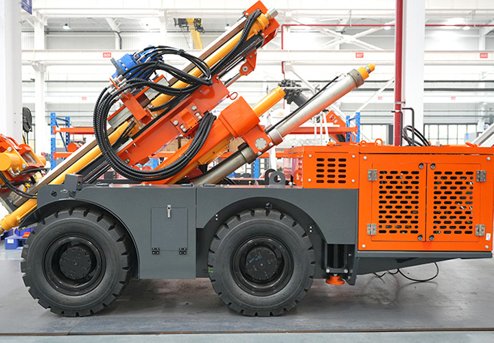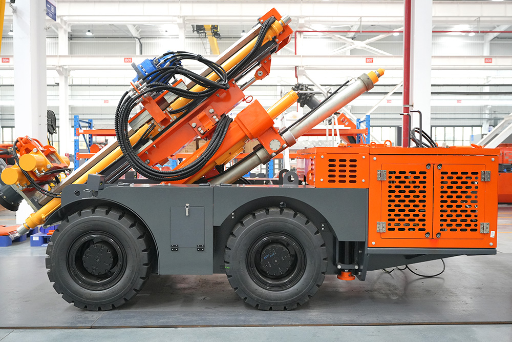 KODT-125是一款輪胎式礦用潛孔鉆機,電壓等級:380V,采用潛孔沖擊器作業,閉式四驅液壓系統,適用于3.3-4m地下采場環形孔的穿鑿,是專用的穿孔設備,也可用于天井和斜井的開鑿及回采作業。主要功能和裝置如下:適用于鉆孔直徑范圍120-254mm,鉆孔深度0-100m;鉆架可環向360°旋轉,前后-10°-55°度擺動,適用于環向打孔;鉆臂裝載有液壓穩桿機構,保證鉆孔直度,偏斜率≤1%;機身配有頂升支腿和后擺動橋,可在路面坑洼惡劣條件下工作;設備四驅驅動,可實現360°轉彎,原地掉頭;長距離移動時,設備可解鎖制動,且配備牽引,方便使用拖車進行快速移動;鉆機回轉具有無級調速功能,可根據不同巖層狀況調整鉆速,提高效率;且設備配置遙控裝置,方便操作人員操作設備的同時,提高了操作安全性和可靠性;設備配備了沖洗裝置,方便操作人員清理設備,維持設備整潔,提高設備使用壽命。